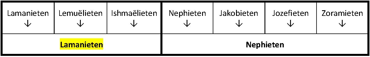 Zo komen we in 74 v.C. op het punt waar de Nephieten “gedwongen werden geheel alleen de Lamanieten te weerstaan, die een mengeling waren van Laman en Lemuël en de zonen van Ishmaël, en allen die zich hadden afgescheiden van de Nephieten, namelijk de Amalekieten en de Zoramieten en de afstammelingen van de priesters van Noah” (43:13). Kortom, de Lamanieten omvatten “allen die zich van de Nephieten hadden afgescheiden, sedert de regering van Nephi tot op heden” (Alma 47:35).